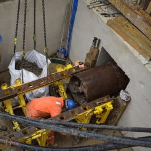 We began Boring with the auger being filled, and as the sacrificial steel sleeve was pushed into the ground, the flight augers were simultaneously rotated. The flight augers were then retracted to the drive shaft, clearing any loose spoil that remained inside the sleeve. Each section of the flight auger was disconnected and lifted to the surface as it arrived in the drive shaft. The spoil from the augers was discharged into the drive shaft, loaded into skips, and removed from the pits using the 13t machine. The spoil removal process was closely monitored to assess its correspondence to the volume of the installed sleeve, with an expected increase of approximately 15-20% after accounting for bulking. Upon completion of the auger-boring, the auger machine master frame and ancillary items were removed.