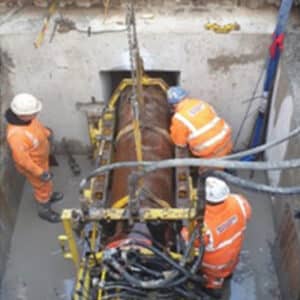 In order to accommodate the guided auger-boring equipment, reinforced concrete thrust walls were constructed in the drive pits, with two sides measuring 300mm thick and the other two sides measuring 500mm thick. The construction of formwork walls involved the use of shuttering ply, timbers, and reinforcement A393 mesh. Once the concrete was poured into the formwork, the walls underwent testing to ensure that they had achieved the required strength as per the design specifications.